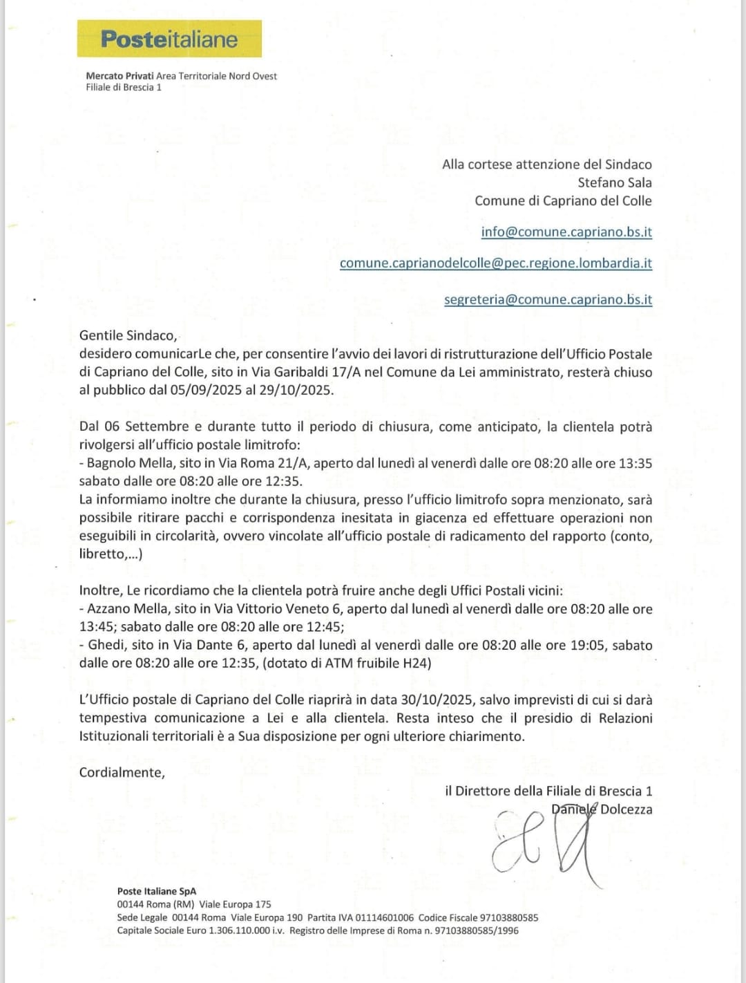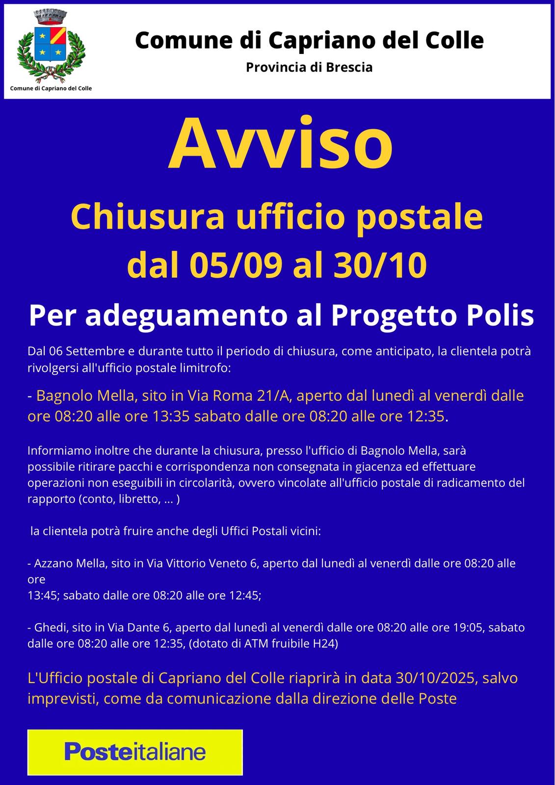 Con la presente si comunica che dal 05 Settembre al 30 Ottobre 2025 l’ufficio postale di Capriano rimarrà chiuso per adeguamento progetto Polis
